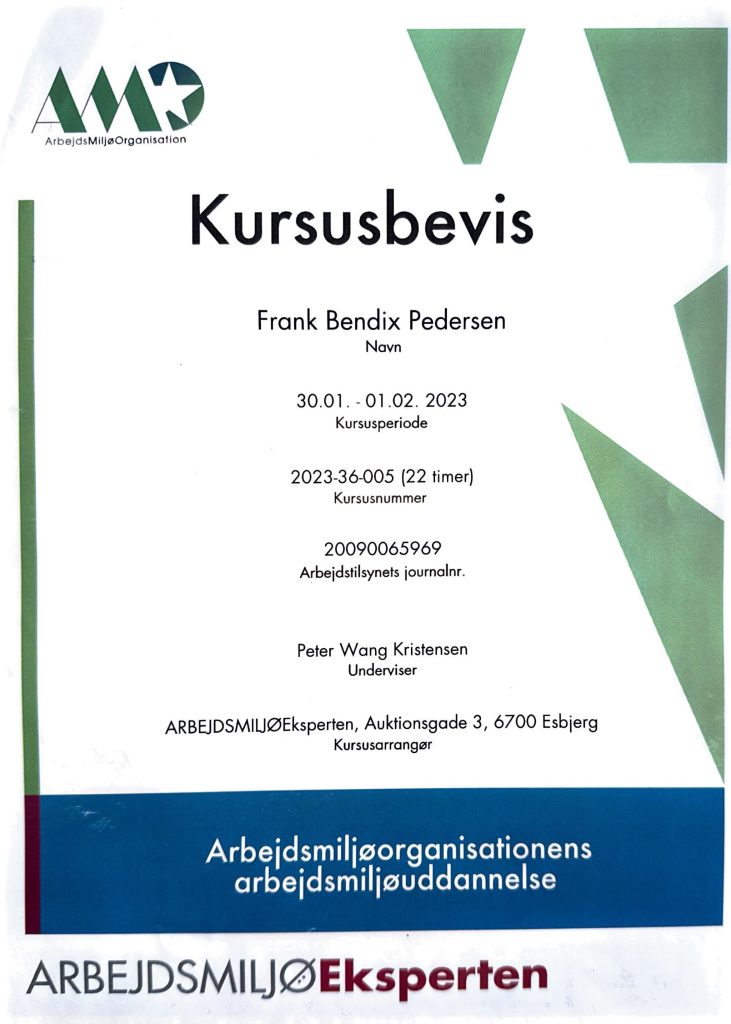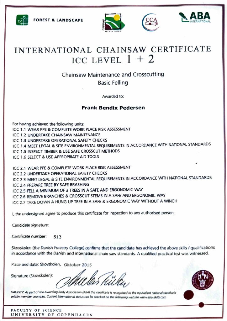 Som fagfolk lægger vi vægt på, at arbejdet udføres korrekt og sikkert. Derfor har vi også relevante kurser og certificeringer, blandt andet motorsavscertificering samt kompetencer inden for arbejdsmiljø og sikkerhed i forbindelse med arbejdet.